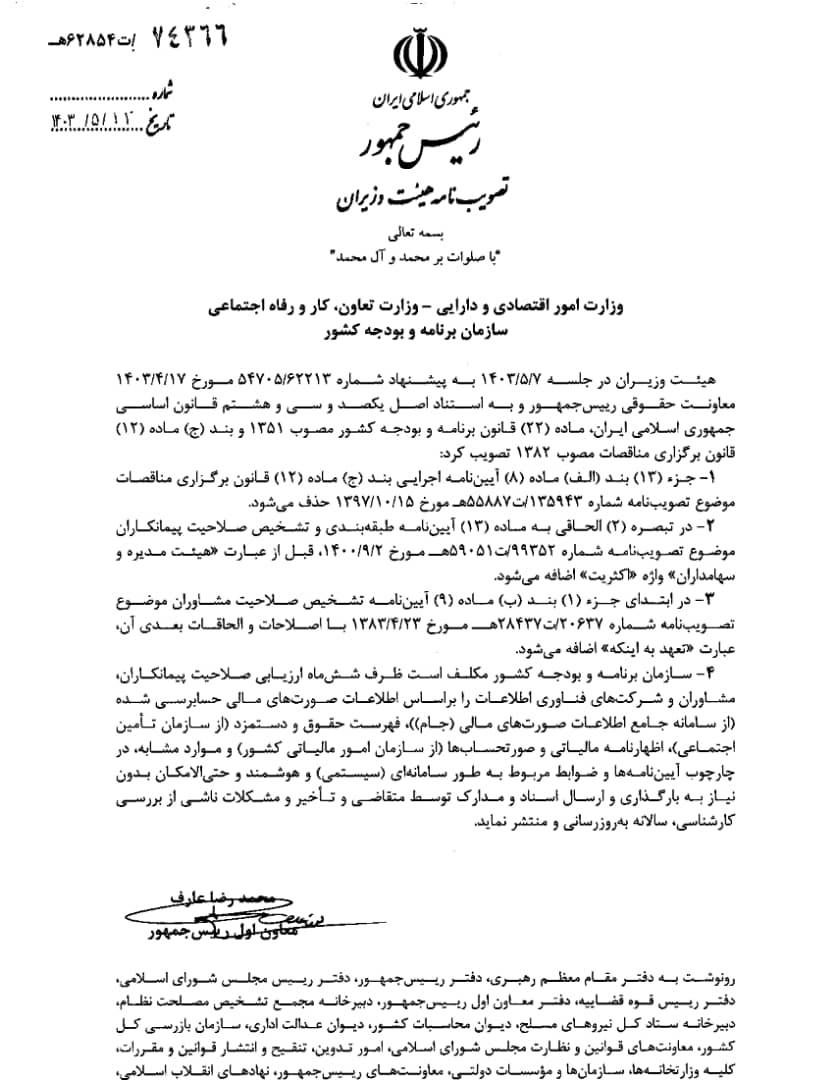مصوبه هیات وزیران در مورد اصلاحات آییننامههای تشخیص صلاحیت مشاوران و پیمانکاران