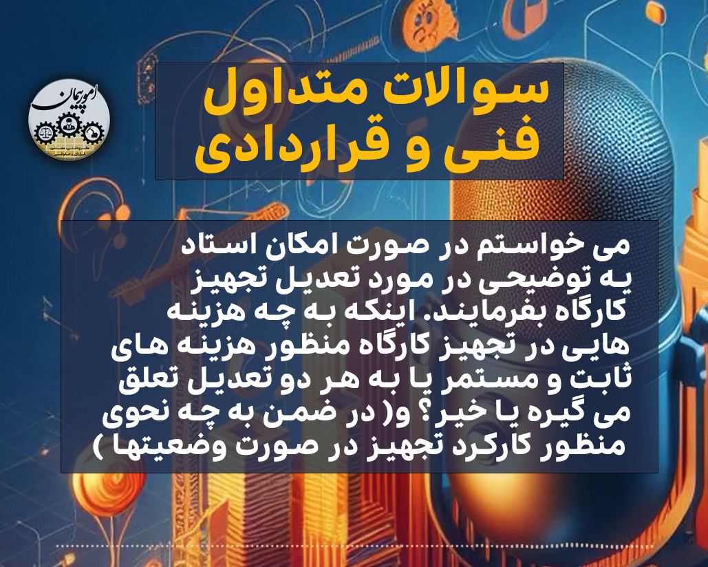 می خواستم در صورت امکان استاد یه توضیحی در مورد تعدیل تجهیز کارگاه بفرمایند. اینکه به چه هزینه هایی در تجهیز کارگاه منظور هزینه های ثابت و مستمر یا به هر دو تعدیل تعلق می گیره یا خیر؟ و در ضمن به چه نحوی؟ ( منظور کارکرد تجهیز در صورت وضعیتها )
